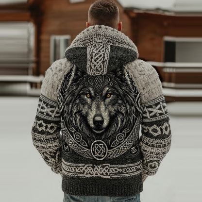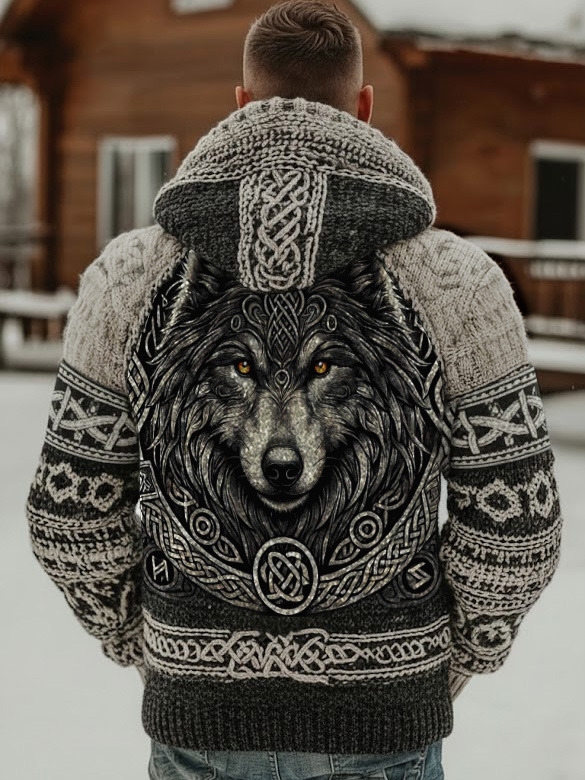 Men's Retro Viking Wolf Pattern Knit Hooded Sweater