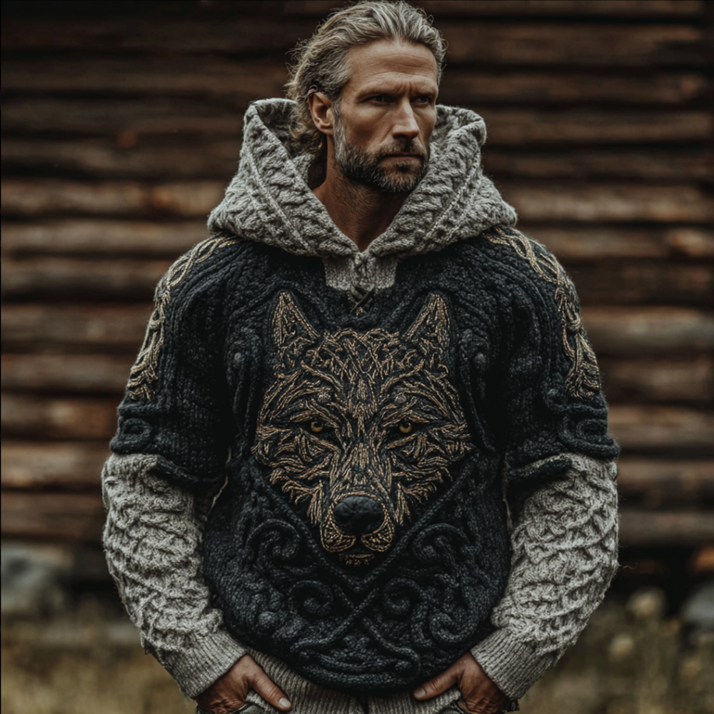 Men's Viking Style Wolf Totem Patchwork Hooded Sweater