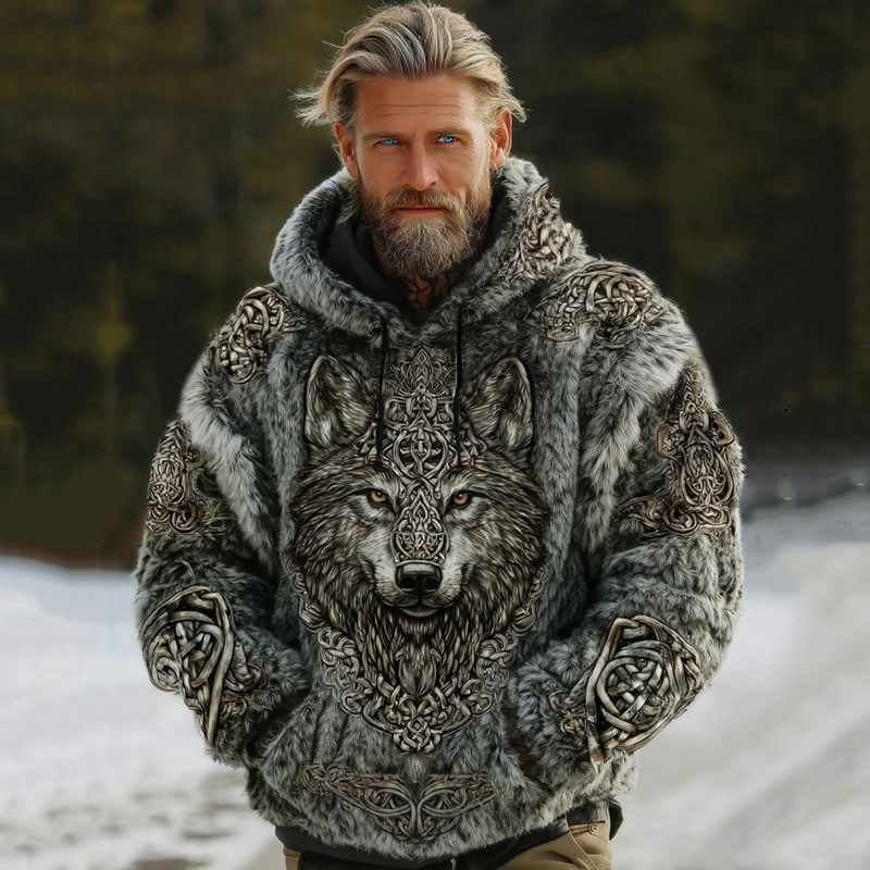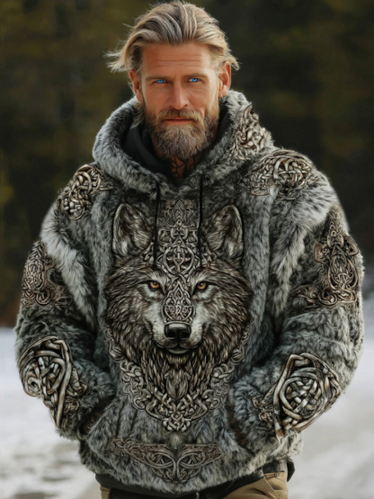 Men's Vintage Tribal Wolf Viking Style Flannel Hooded