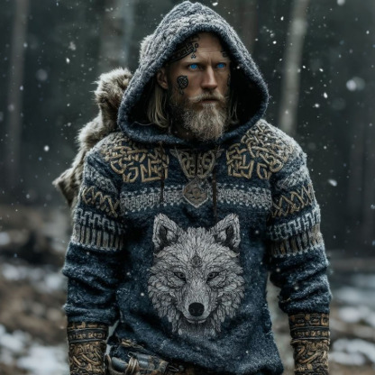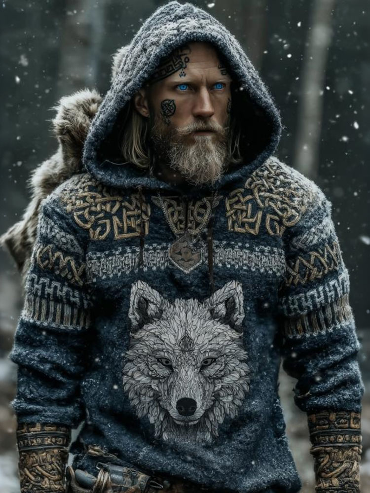 Men's Vintage Tribal Wolf Viking Style Hooded Knit Sweater