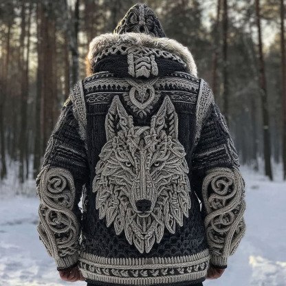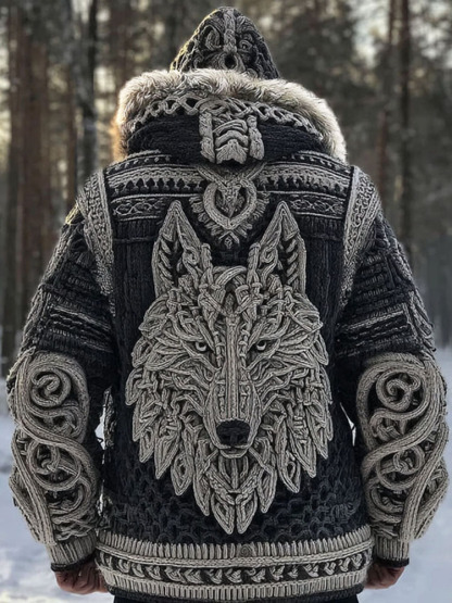 Men's Vintage Viking Wolf Pattern Knit Hooded Zipper Jacket