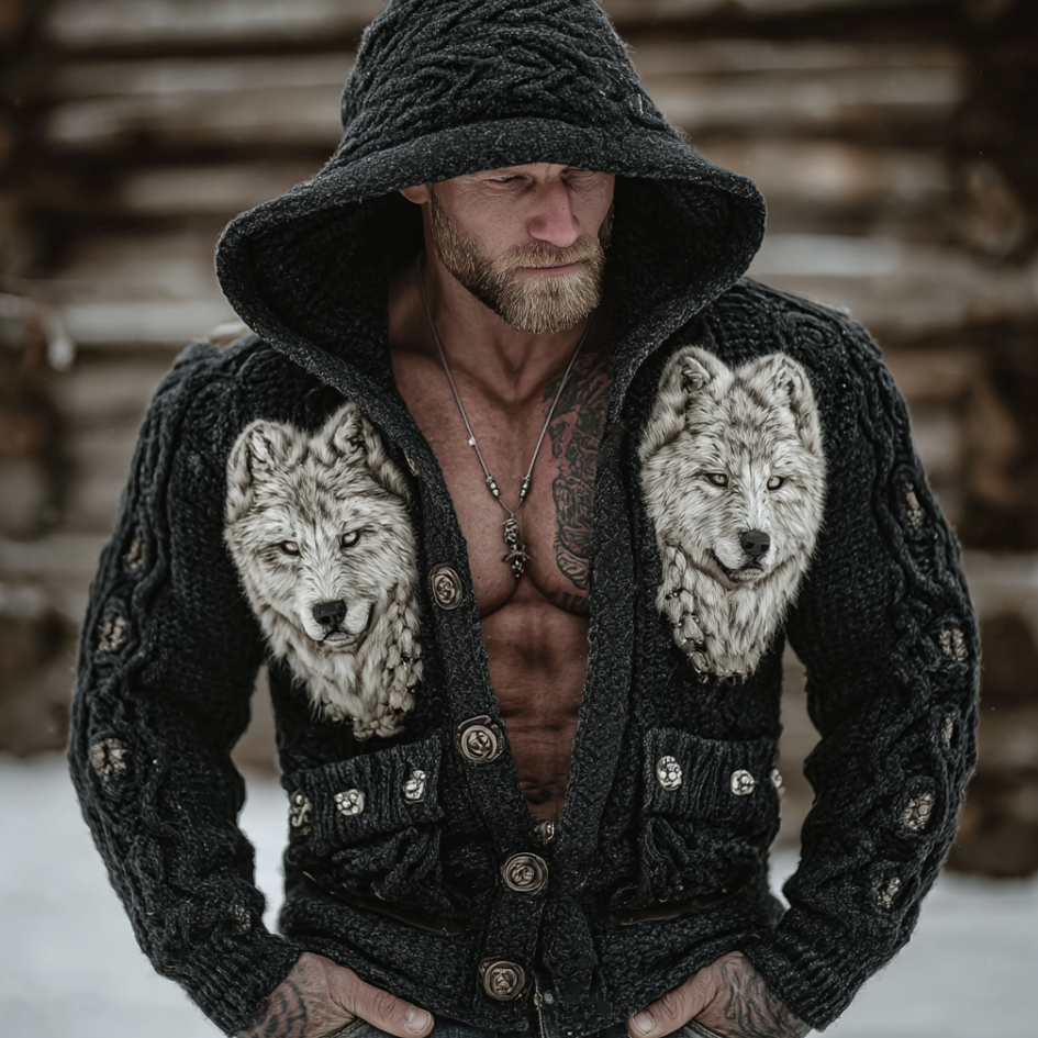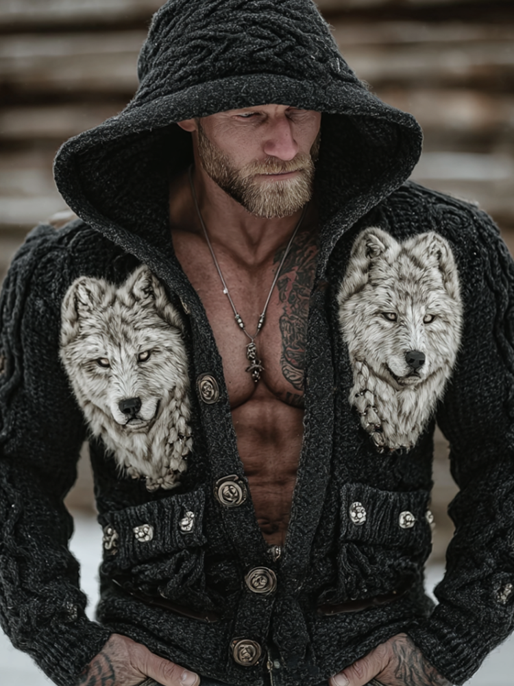 Men's Winter Wolf Retro Viking Style Hooded Knit Sweater Coat