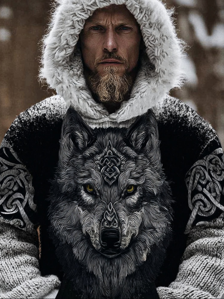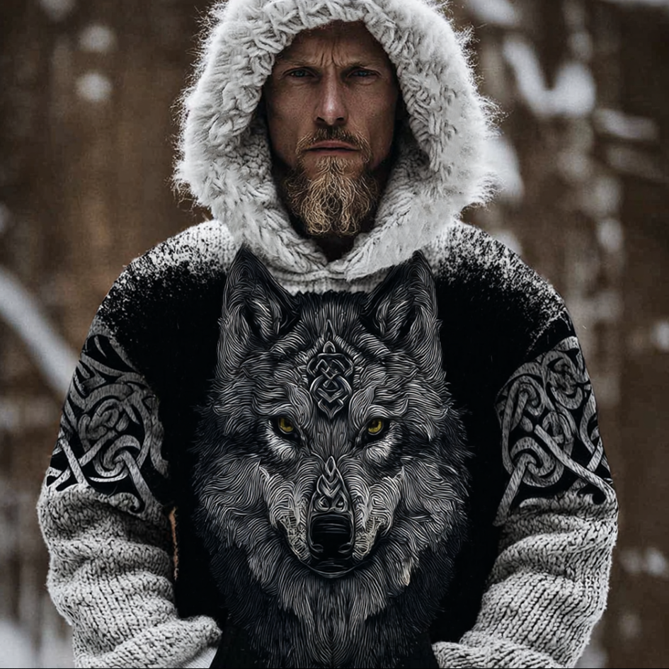 Snow Wolf Retro Viking Style Men's Hooded Knit Sweater