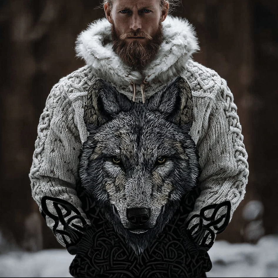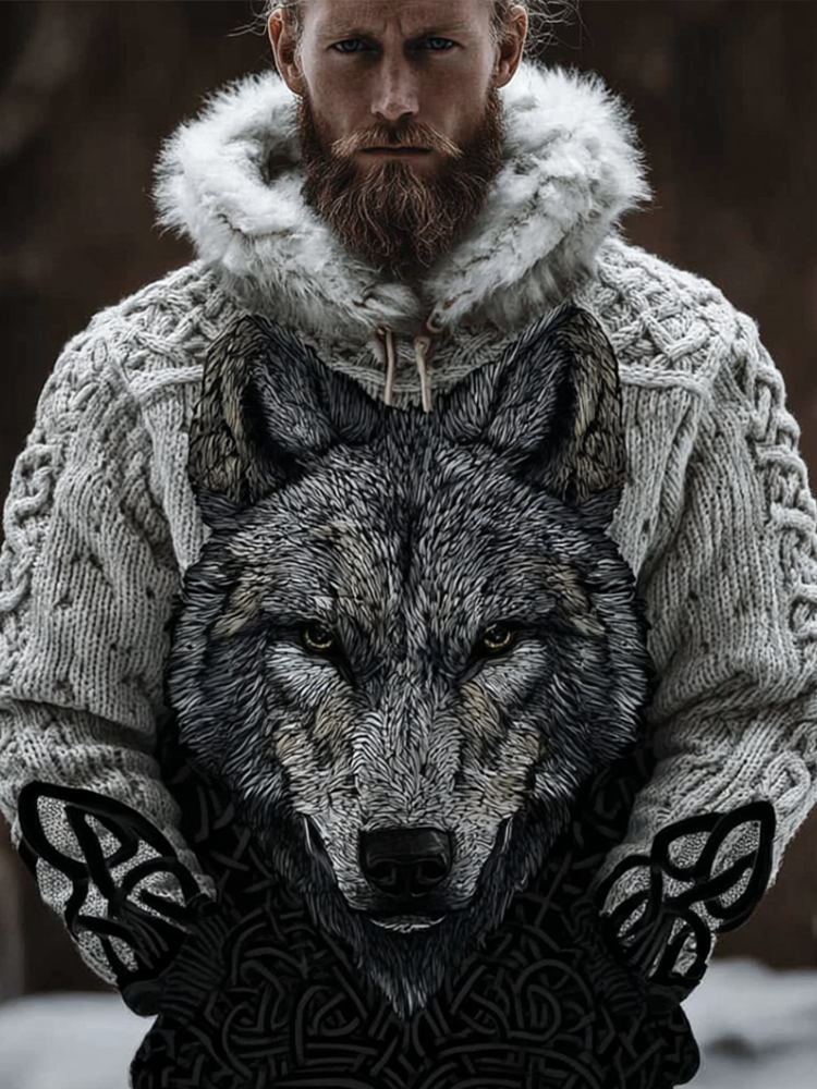 Snow Wolf Retro Viking Style Men's Hooded Knit Sweater